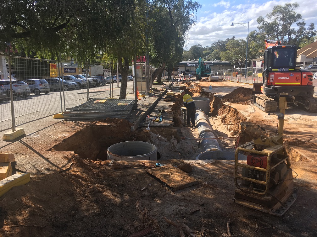 Working directly through the town centre of Kalamunda, Densford Civil installed over 400 metres of stormwater drainage through hard laterite rock. Constant stake holder and community engagement was essential, ensuring all businesses maintained productivity whilst rock breaking, open trenching and reinstatement to match the existing conditions, occurred down the main streets. A good working relationship was established with the City of Kalamunda, impressed with Densford Civil’s ability to follow up complaints and clearing issues as they arose in a prompt manner.